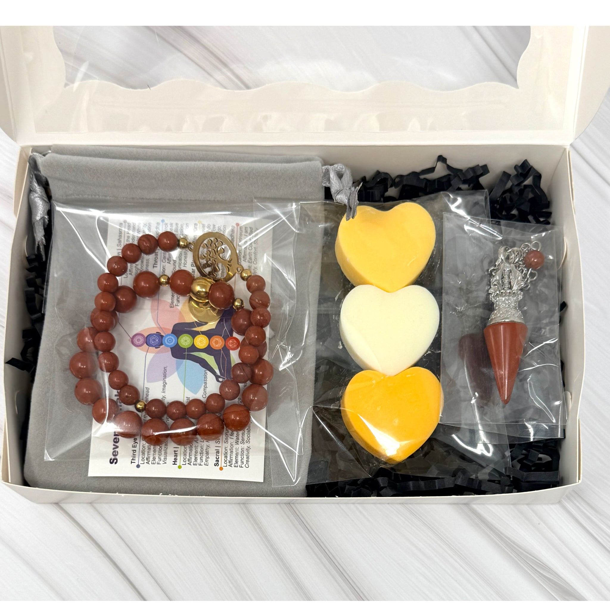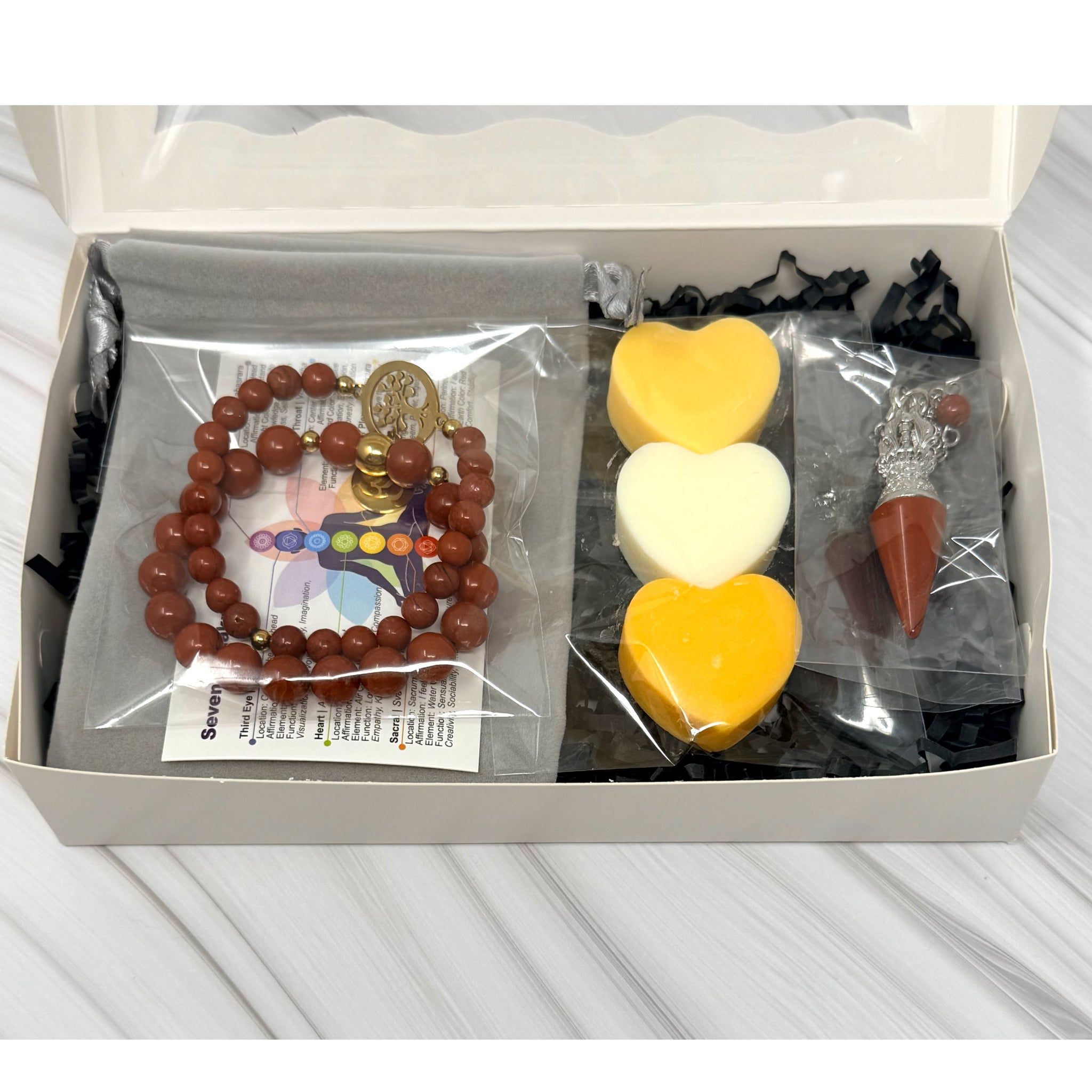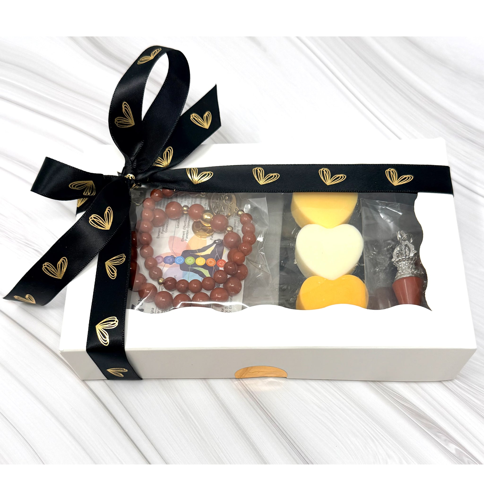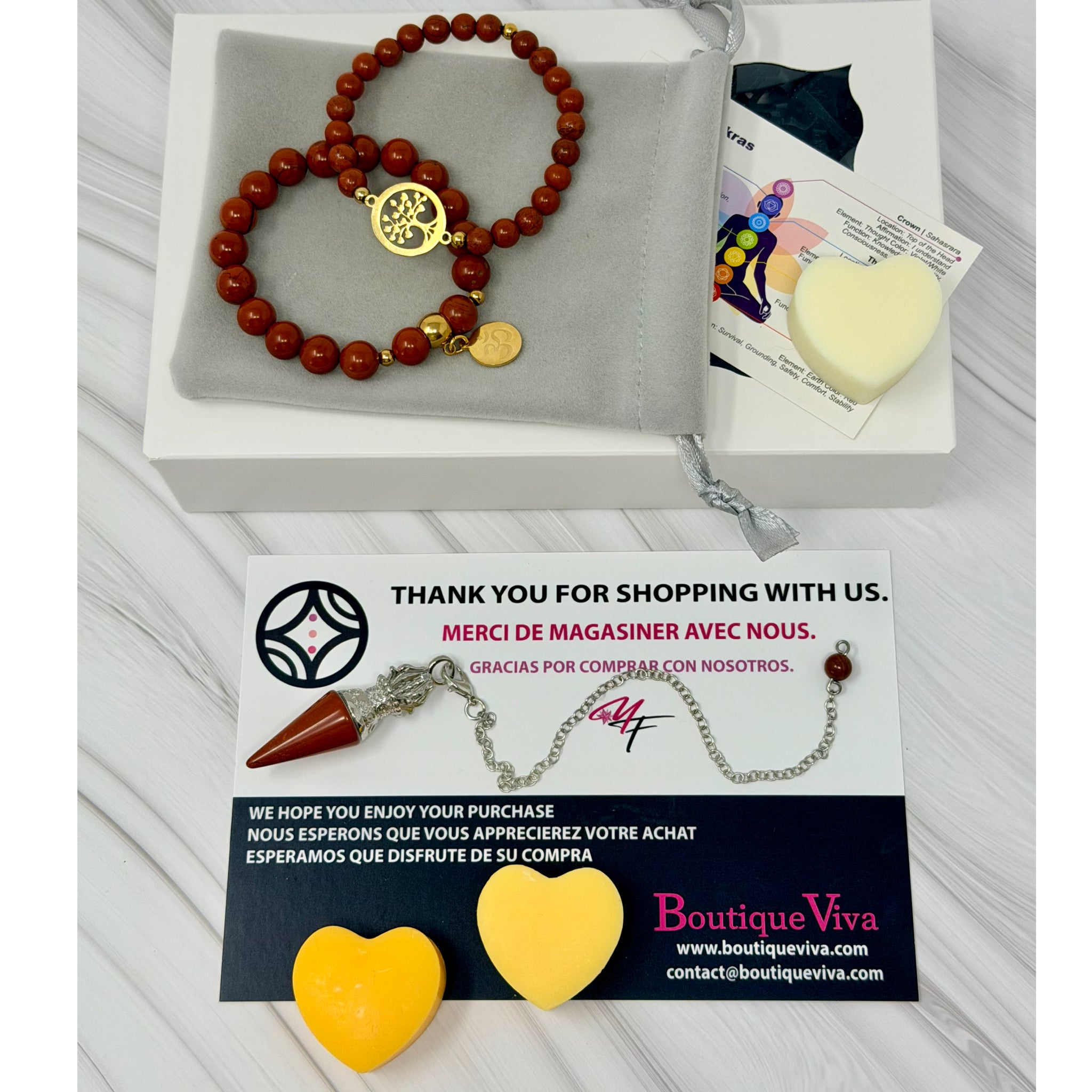 This bundle combines the warm, comforting aroma of white Flower scented heart soy wax melts with the grounding energy of Red Jasper, making it the perfect gift for someone who needs confidence, balance, and a reminder to stay rooted in their power.